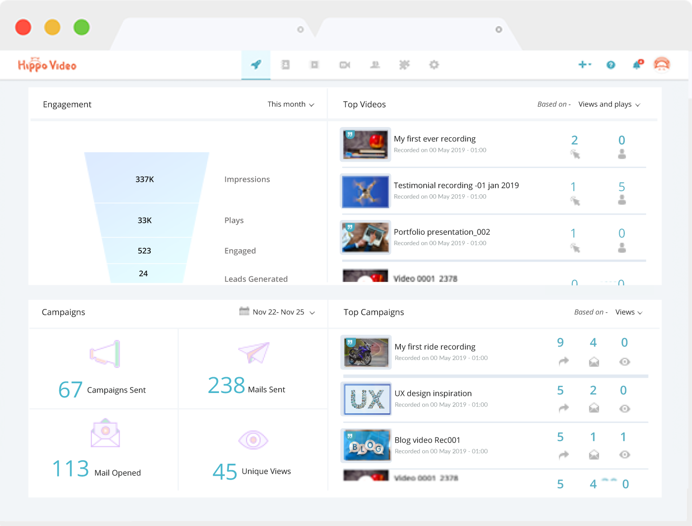Track a single email or many at a time and see how your video emails are performing; click rates, open rates, watch rate, watch duration and more. Yes, we want you to have it all.